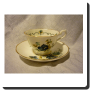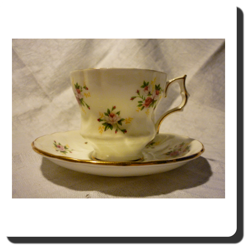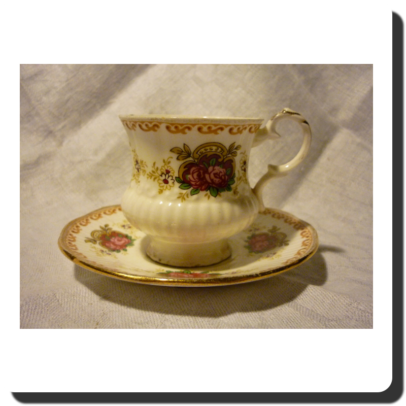 Ongeveer 100 jaar oude theekopjes met suikerpot met gestreept art deco bloemenpatroontje, 'Johann Haviland - Bavaria'.